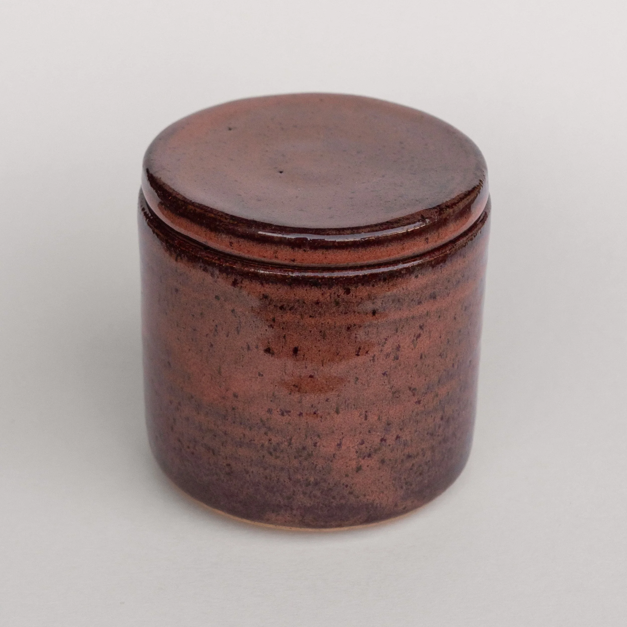 This butter bell is glazed in a glossy blue glaze, measures about 3 ½ wide by 4” tall, and its bell holds about 7.5 oz.