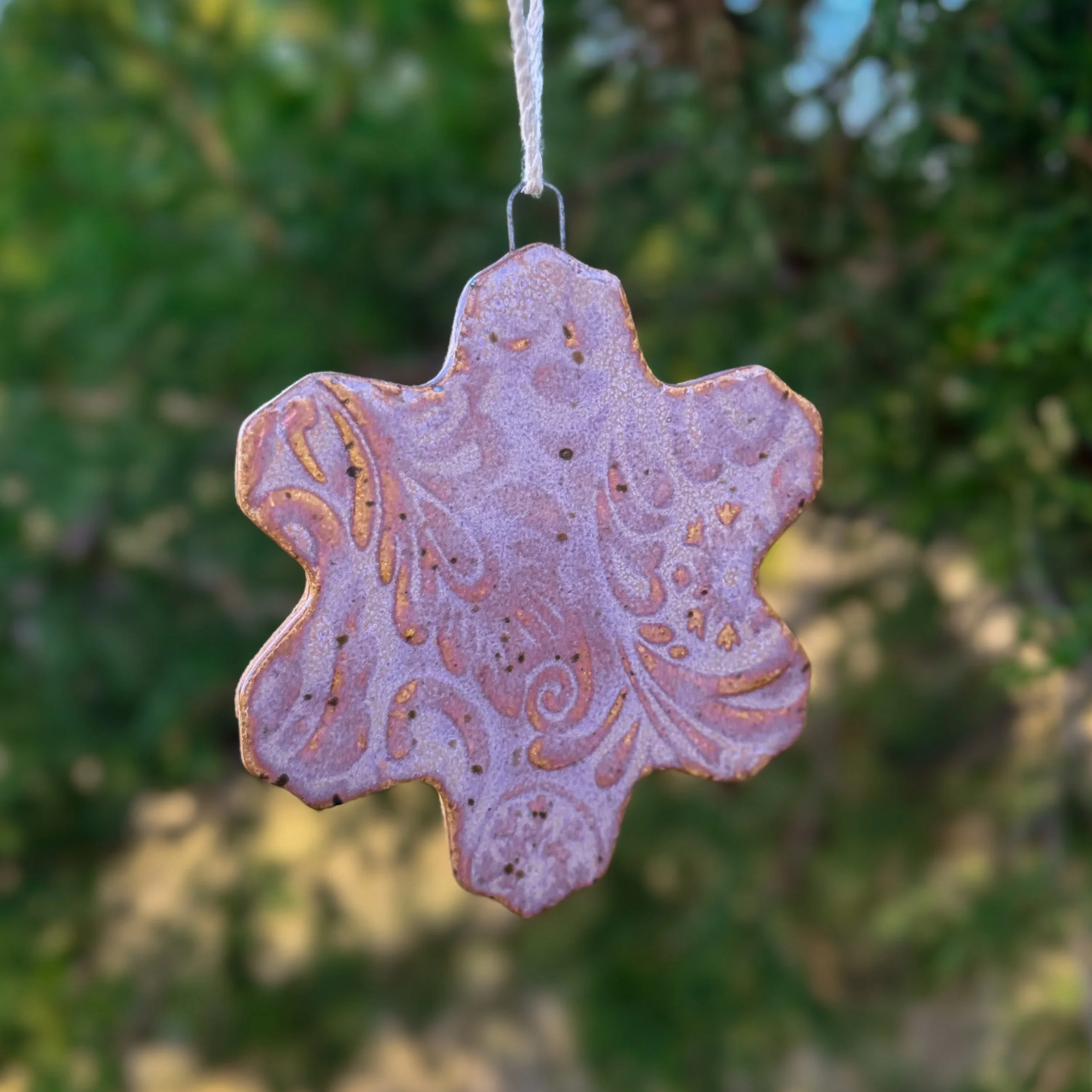 Delicate and ornate, this handcrafted snowflake ornament will add the perfect festive touch to any tree! It features a glossy purple glaze that highlights the holiday pattern of the ornament by turning a golden color over areas of texture.