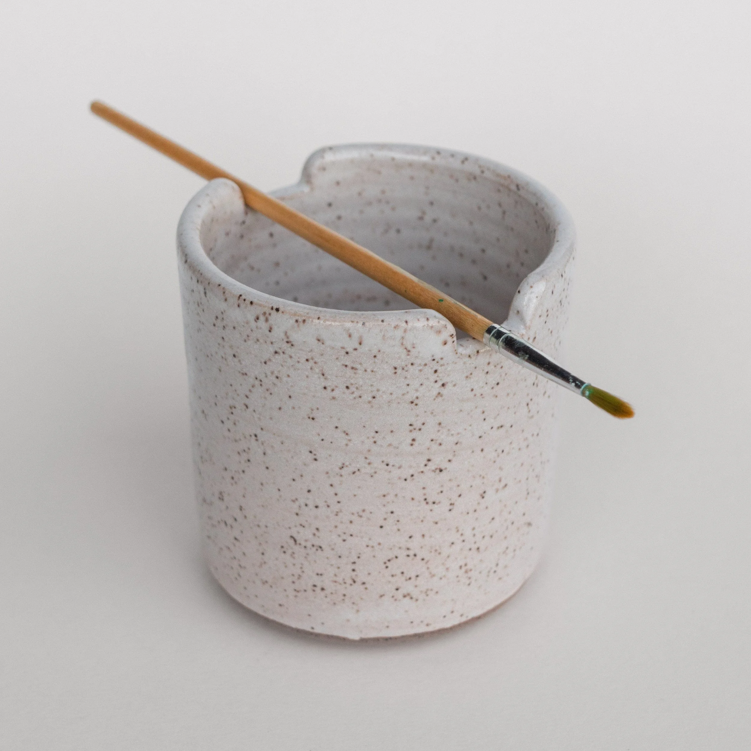 This cup is glazed in a white glaze and is ready to be the perfect accessory to your painting space.
